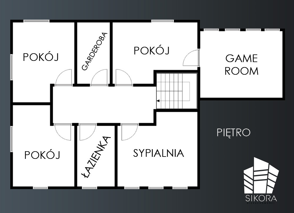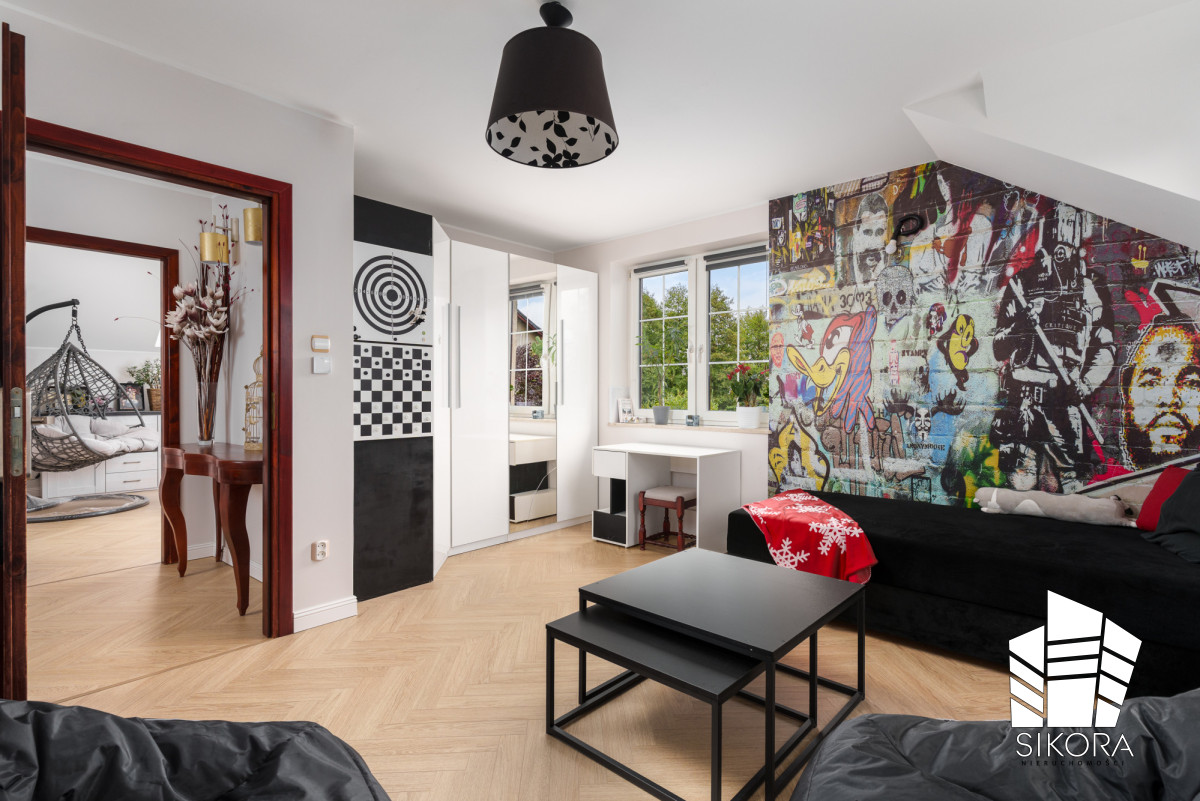 SYPIALNIA POŁUDNIOWA:Pokój o młodzieżowym, dynamicznym charakterze, idealny dla konesera nowoczesnego designu. Głównym akcentem jest ściana ze spektakularną, wielkoformatową fototapetą w stylu street art/graffiti, nadającą wnętrzu unikatowy, artystyczny wymiar. Mimo odważnego wzoru, pozostała część pomieszczenia jest utrzymana w minimalistycznej, czarno-białej palecie, co równoważy ekspresję. Funkcjonalna strefa sypialni i kącik wypoczynkowy oraz jasne biurko zapewniają komfort nauki i relaksu. Z pokoju prowadzi otwarcie do kolejnego pomieszczenia, gdzie widoczny jest podwieszany, rattanowy fotel/kokon, stanowiący dodatkowy, luksusowy element wypoczynkowy.