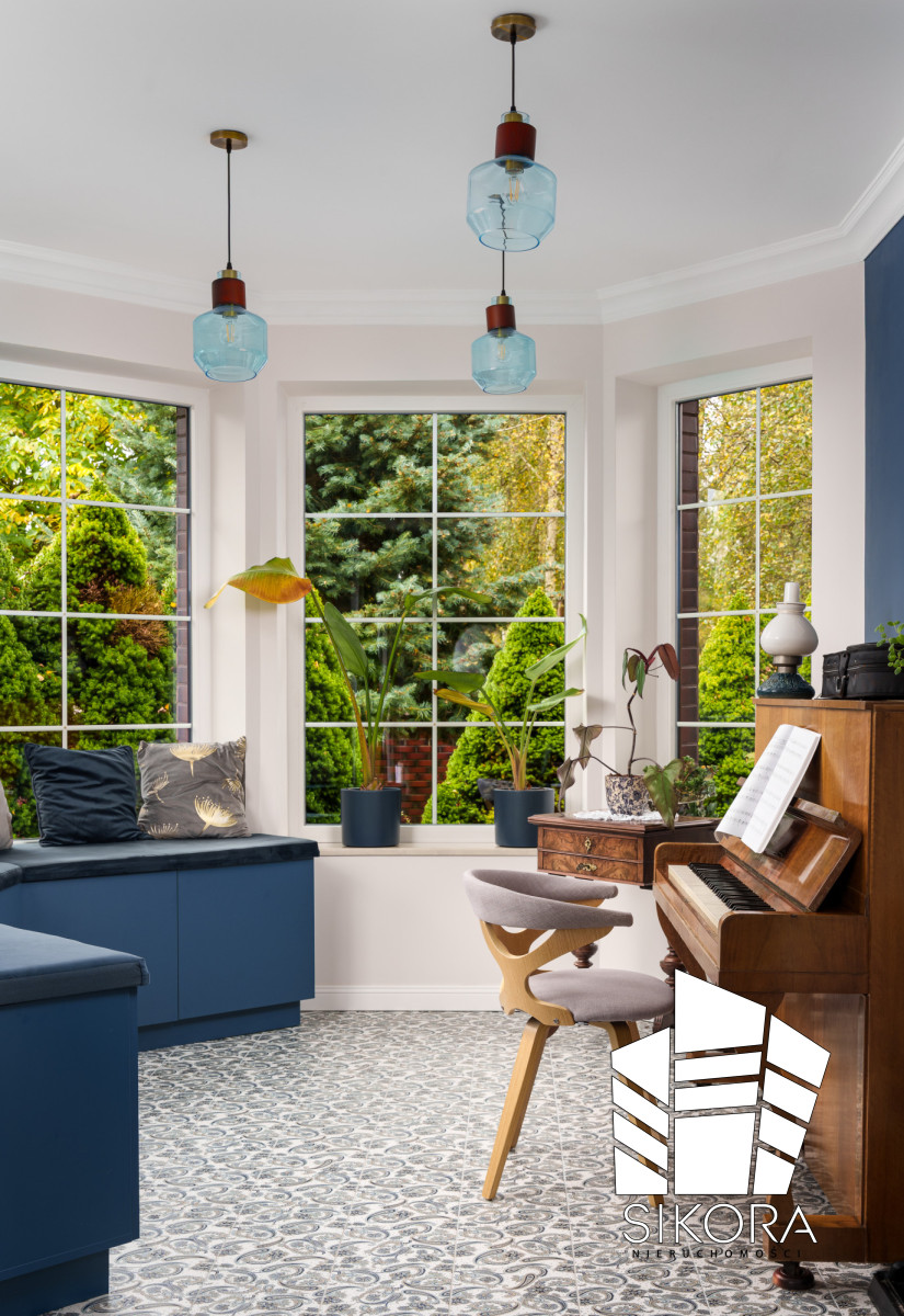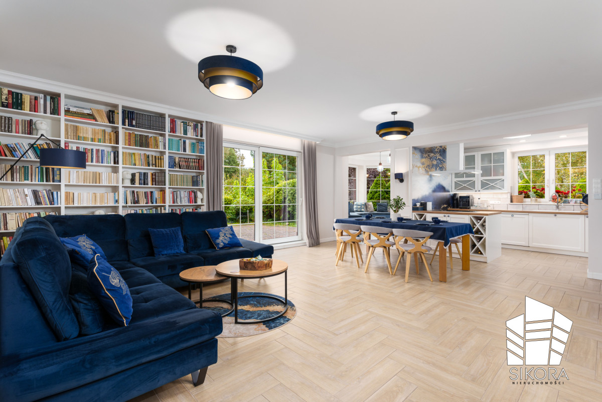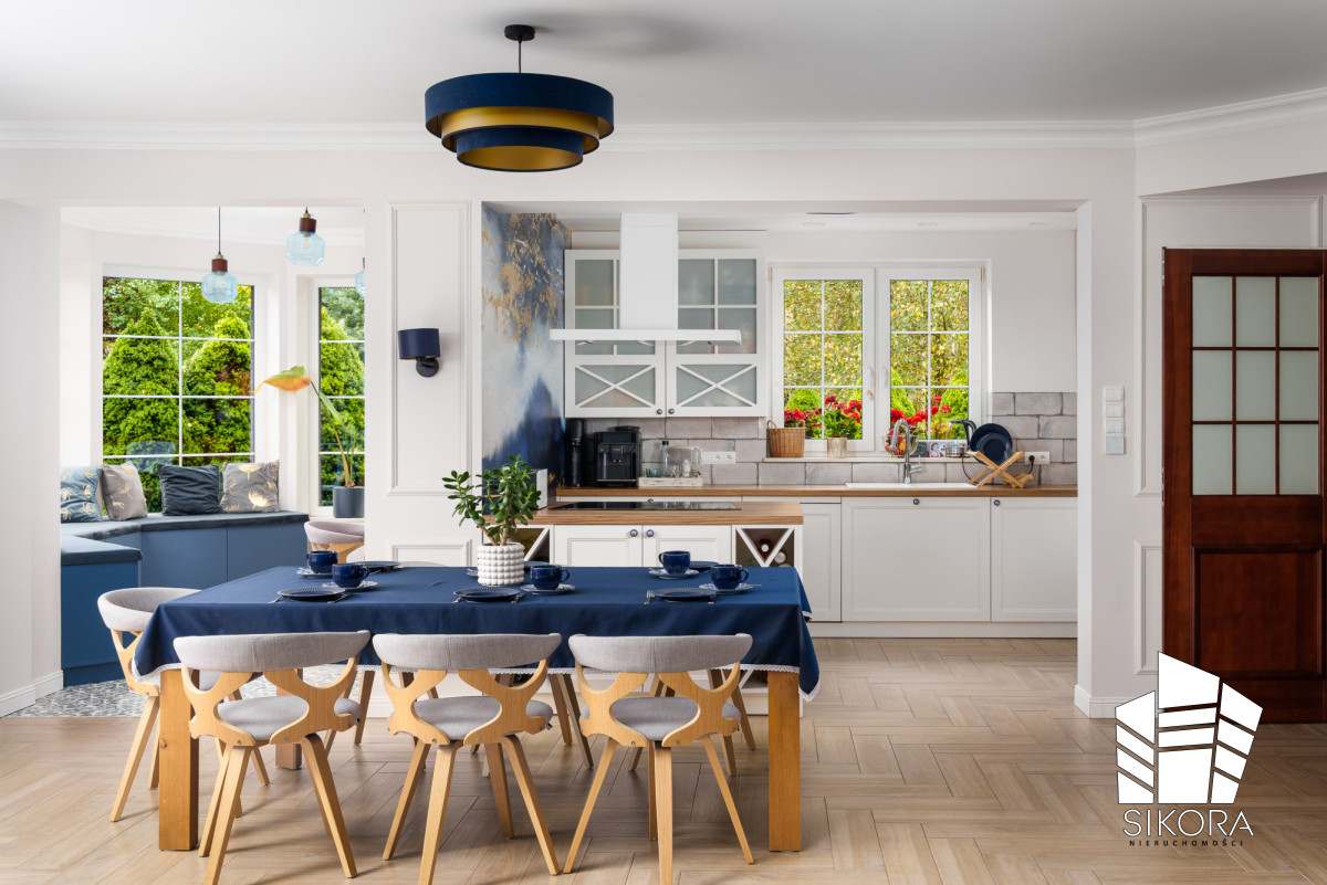 Przestrzeń jest obficie doświetlona światłem naturalnym wpadającym przez duże, przesuwne drzwi tarasowe, które zacierają granicę między wnętrzem a doskonale utrzymanym ogrodem. Całość wieńczą ekskluzywne listwy sufitowe i przypodłogowe, a dopracowane oświetlenie wiszące, z granatowymi abażurami o złotym wnętrzu, dodaje wnętrzu głębi i ciepła.