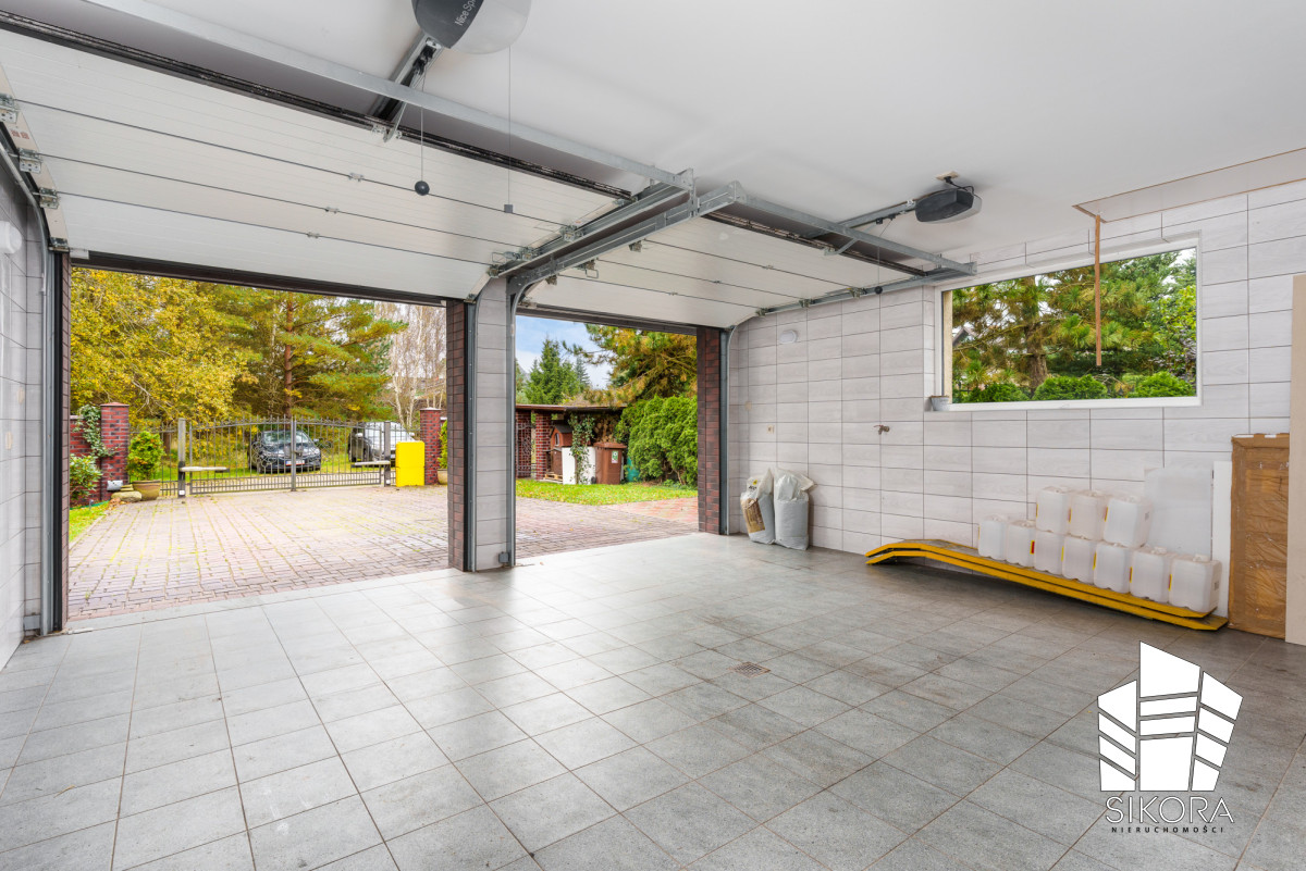 Dostęp do wnętrza umożliwiają dwie niezależne, automatyczne bramy garażowe, gwarantujące wygodę użytkowania niezależnie od warunków pogodowych. Duża przestrzeń manewrowa przed budynkiem, wyłożona kostką brukową, ułatwia wjazd i wyjazd.