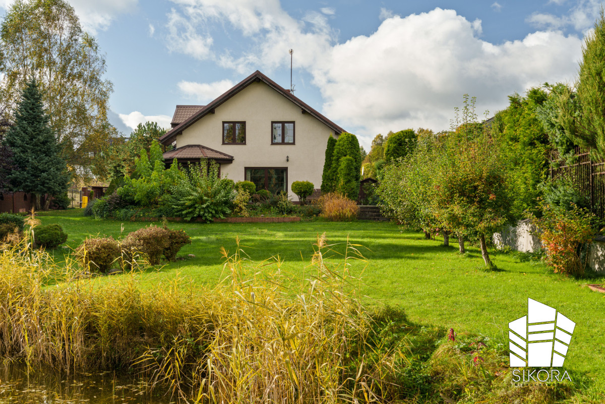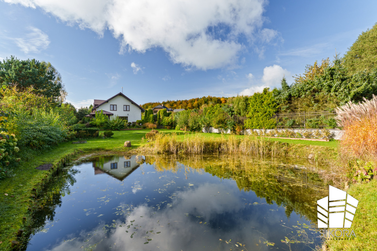 Posiadłość położona jest na pięknej, przestronnej działce o powierzchni 1653 m², która stanowi prawdziwą oazę spokoju i prywatności. Starannie wypielęgnowany trawnik, rozłożyste krzewy oraz dojrzałe drzewa tworzą naturalną, zieloną oprawę dla domu. Centralnym punktem ogrodu jest malowniczy staw, który nadaje posesji wyjątkowego charakteru i wprowadza atmosferę harmonii z naturą.