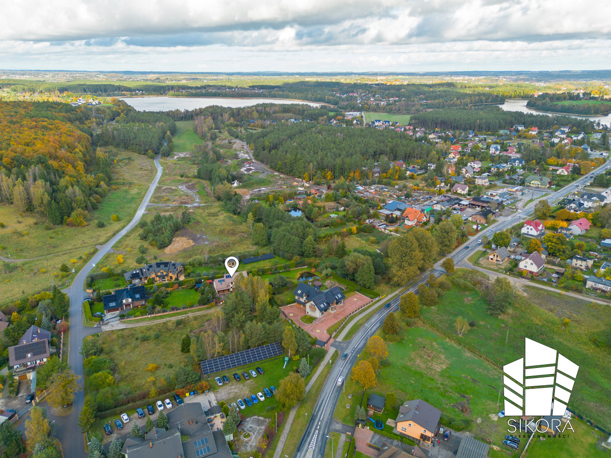 OKOLICA:Bezpośrednie otoczenie nieruchomości to spokojna, zielona przestrzeń o charakterze rezydencjalnym. W najbliższym sąsiedztwie znajdują się eleganckie domy jednorodzinne, a cała okolica emanuje harmonią i poczuciem prywatności. W zasięgu krótkiego spaceru dostępne są sklepy, szkoła, przedszkole oraz przystanek komunikacji publicznej, dzięki czemu codzienne życie jest tu wyjątkowo wygodne. Kilka minut dzieli to miejsce od lasów i ścieżek prowadzących nad jeziora - idealnych na poranny jogging, spacery z psem czy popołudniową przejażdżkę rowerową. To okolica, która pozwala zwolnić tempo i poczuć prawdziwy komfort życia blisko natury, nie rezygnując z wygód miasta.