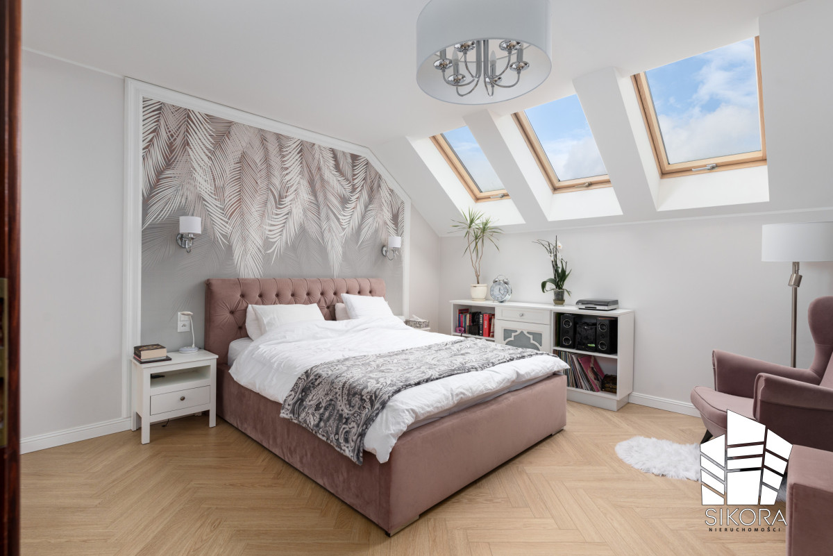Unikalny charakter nadają trzy duże okna dachowe, które otwierają przestrzeń na niebo, zapewniając obfitość naturalnego światła i możliwość obserwowania gwiazd. Elegancję podkreśla kącik wypoczynkowy z welurowym fotelem oraz podłoga w ciepłym odcieniu dębu ułożona w jodełkę.