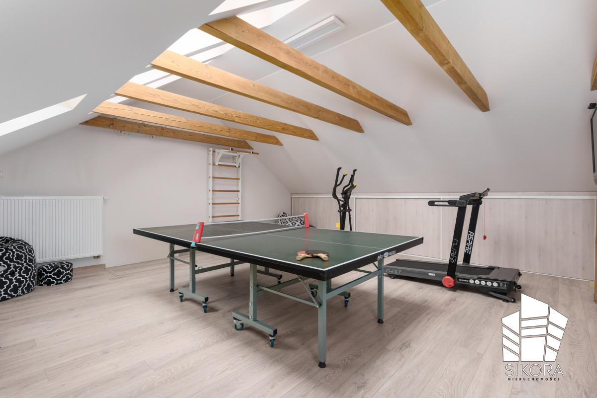 Przestronna i inspirująca przestrzeń dedykowana aktywności fizycznej i rekreacji. Pomieszczenie charakteryzuje się otwartym sklepieniem z widocznymi, surowymi belkami konstrukcyjnymi z jasnego drewna, co nadaje mu loftowy, naturalny charakter. Doskonale doświetlone oknami dachowymi, oferuje idealne warunki do ćwiczeń. Wyposażenie obejmuje profesjonalny stół do tenisa stołowego, bieżnię oraz drabinkę gimnastyczną. Jest to idealne, prywatne centrum fitness, zapewniające rekreację bez wychodzenia z domu.
