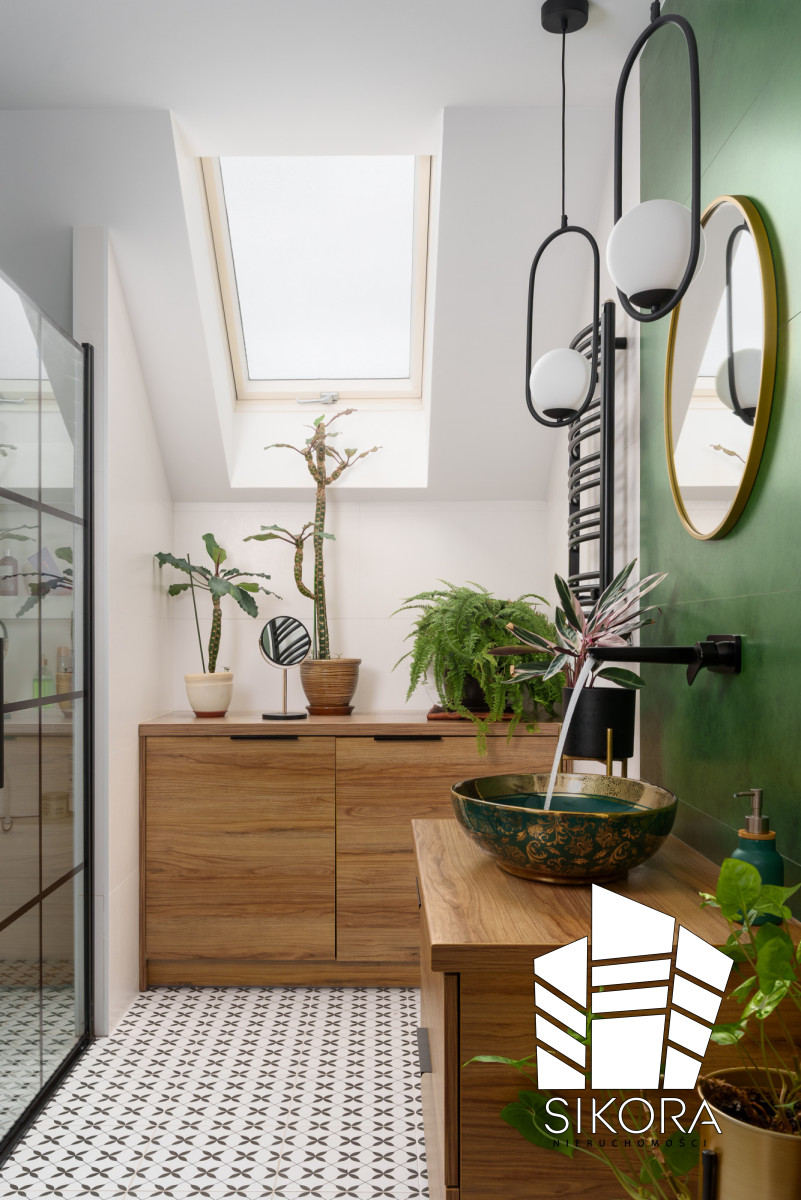 Naturalne drewniane blaty i szafki wprowadzają ciepło, idealnie kontrastując z czarno-białą podłogą w stylu patchwork. Kabina prysznicowa typu walk-in z czarnymi, industrialnymi profilami stanowi luksusowe dopełnienie całości. Całość jest obficie doświetlona światłem dziennym z okna dachowego, co sprzyja hodowli roślin, potęgując efekt bliskości natury (Jungle Bathroom).
