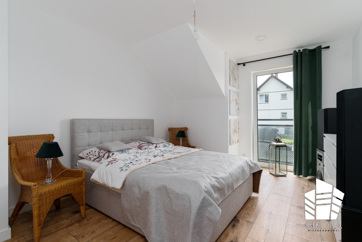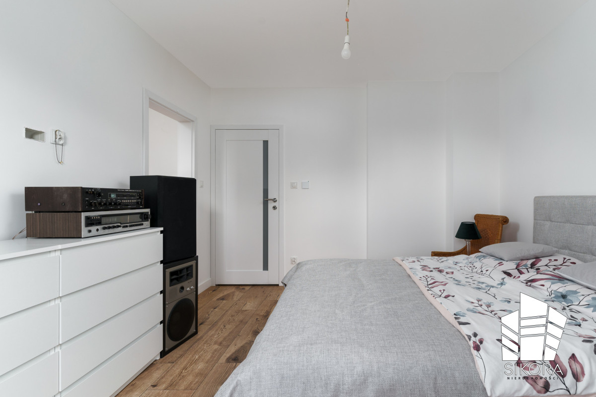 W pokoju znajdziemy wygodne łóżko małżeńskie z szafkami nocnymi. Dodatkowo w sypialni wygospodarowano przestrzeń garderobianą, która obecnie służy właścicielom jako pojemna przestrzeń na ubrania. Układ pokoju i okien pozwala wyodrębnić z przestrzeni dwa samodzielne pokoje. Z pokoju mamy dwa wyjścia na balkony typu francuskiego z żaluzjami rzymskimi oraz roletami antywłamaniowymi.