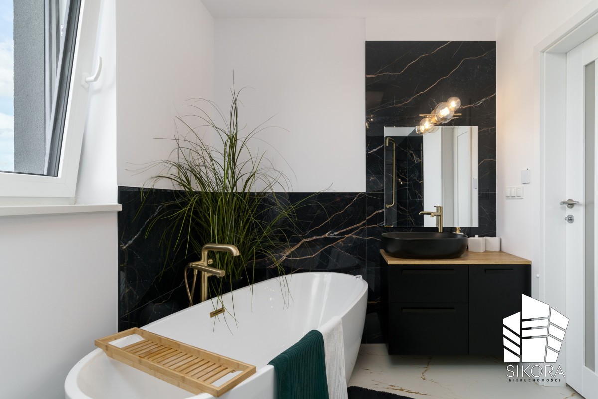 W pomieszczeniu zamontowano nowoczesne oświetlenie, które nadaje klimatu. Znajdziemy tu szafkę z na blatową umywalką, w której schowamy kosmetyki oraz ręczniki, duże naścienne lustro, a także toaletę. Królują barwy bieli, czerni oraz złotych elementów.
