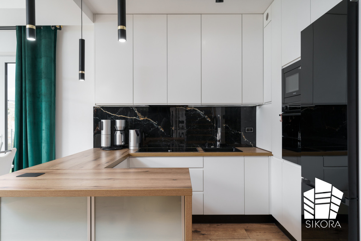 Kuchnia w naszym mieszkaniu jest bardzo przestronna, dobrze doświetlona dzięki dużym panoramicznym oknom rozpościerającym widok na ogród. Pomieszczenie wyposażone zostało w pełną zabudowę kuchenną robioną na wymiar oraz w wysokiej jakości sprzęt AGD - znajdziemy tu piekarnik, mikrofalę, płytę indukcyjną, zmywarkę, lodówkę z zamrażarką oraz zlewozmywak. Bezpośrednio za aneksem znajduje się spiżarnia.