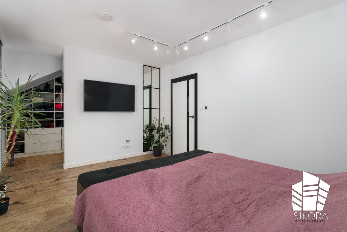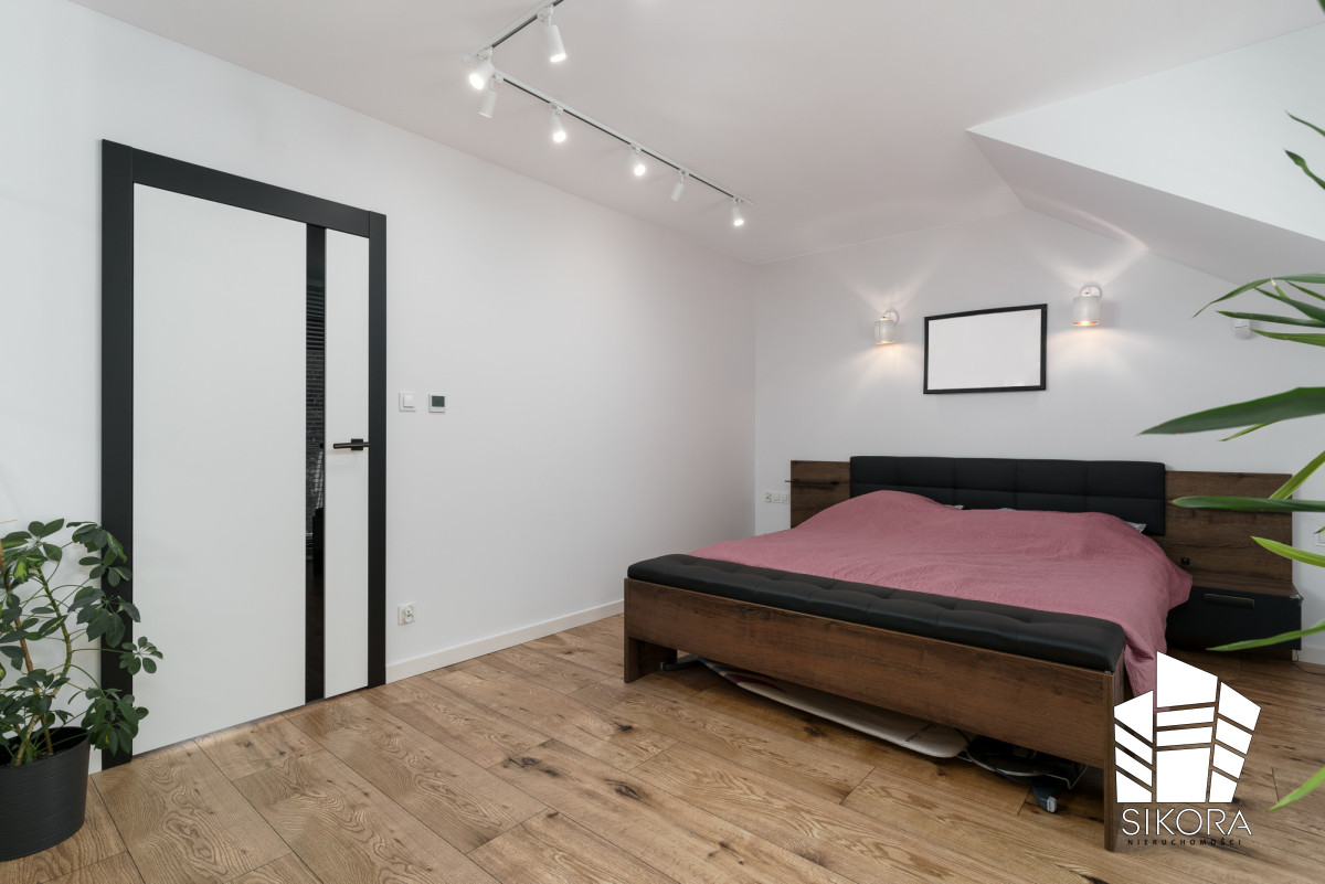 W pokoju znajdziemy wygodne łóżko małżeńskie z szafkami nocnymi. Dodatkowo w sypialni wygospodarowano przestrzeń garderobianą, która obecnie służy właścicielom jako pojemna przestrzeń na ubrania. Układ pokoju i okien pozwala wyodrębnić z tej przestrzeni dwa samodzielne pokoje. Z pokoju mamy dwa wyjścia na balkony typu francuskiego z żaluzjami rzymskimi oraz roletami antywłamaniowymi.