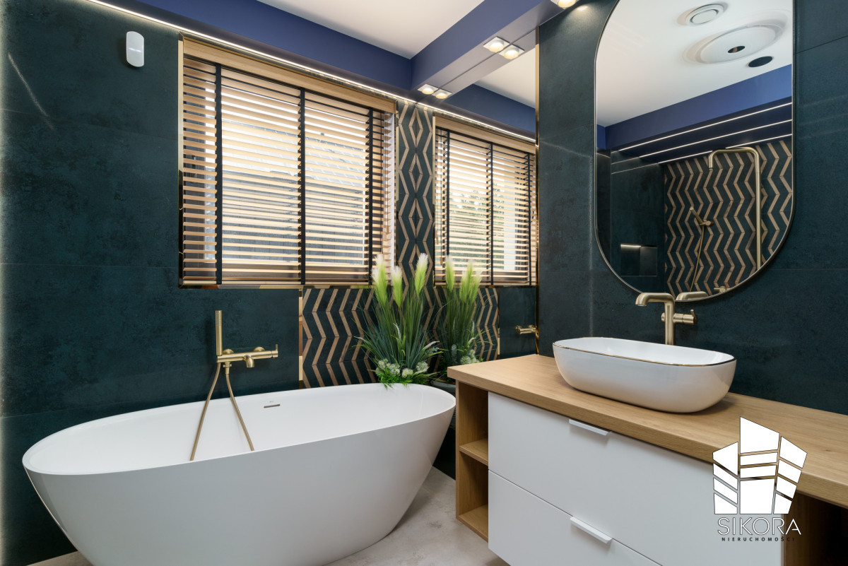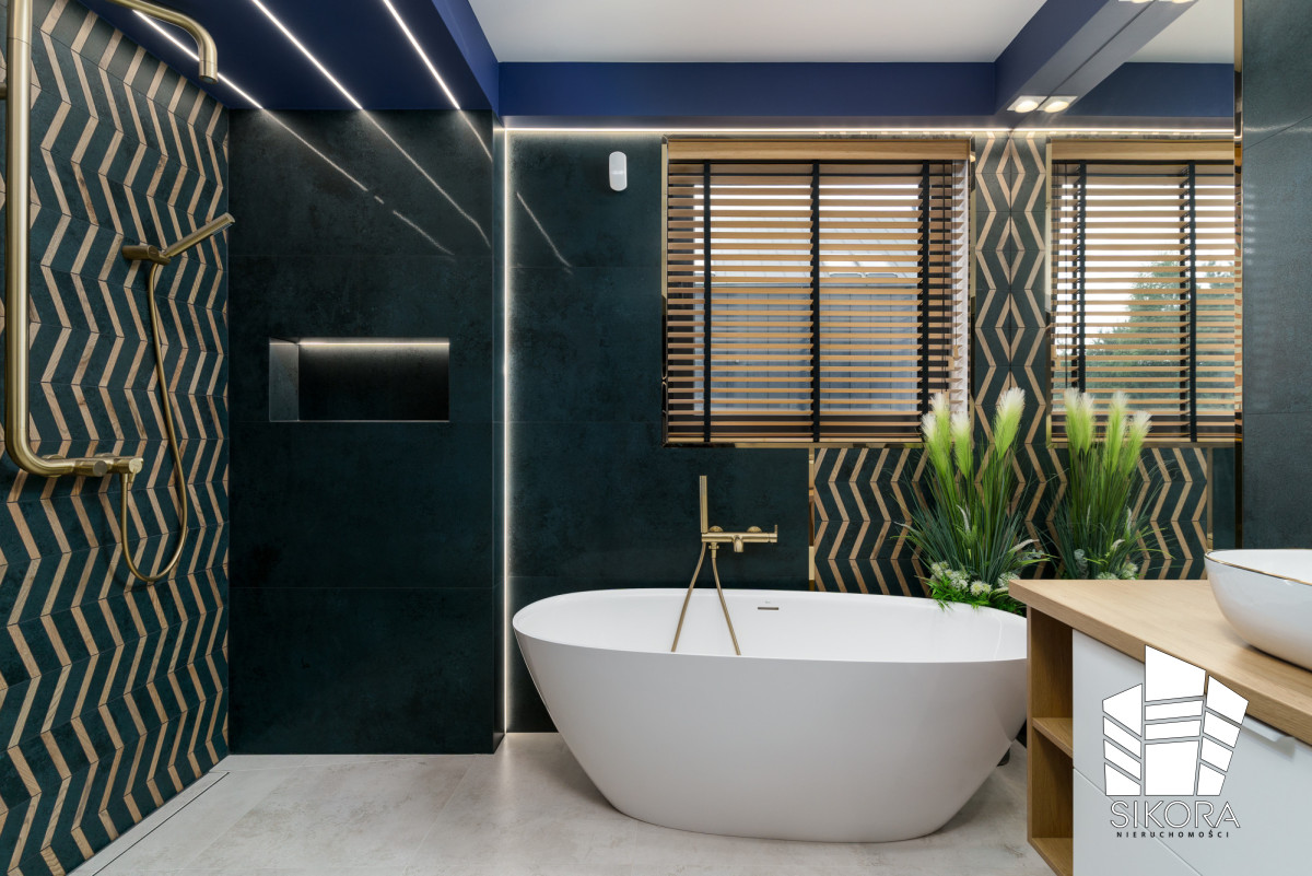 W pomieszczeniu zamontowano nowoczesne oświetlenie, które nadaje klimatu. Znajdziemy tu szafkę z na blatową umywalką, w której schowamy kosmetyki oraz ręczniki, duże naścienne lustro, a także toaletę. Królują barwy bieli, czerni oraz złotych elementów.