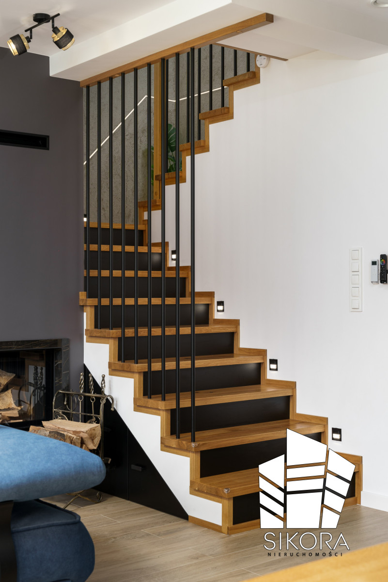 Na piętro dostaniemy się drewnianymi schodami, które oświetlane są nowocześnie zaprojektowanym ściennym systemem świetlnym.