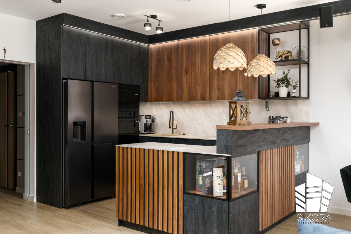 Kuchnia w naszym mieszkaniu jest bardzo przestronna, dobrze doświetlona dzięki dużym panoramicznym oknom rozpościerającym widok na ogród. Pomieszczenie wyposażone zostało w pełną zabudowę kuchenną robioną na wymiar oraz w wysokiej jakości sprzęt AGD - znajdziemy tu piekarnik, mikrofalę, płytę indukcyjną, zmywarkę, lodówkę z zamrażarką oraz zlewozmywak.