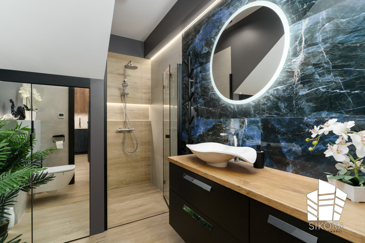 Łazienka na parterze została wyposażona w prysznic typu Walk-in. W pomieszczeniu zamontowano dodatkowe oświetlenie, które nadaje klimatu. Znajdziemy tu szafkę z umywalką na blatową, w której schowamy kosmetyki oraz ręczniki, duże naścienne lustro z dodatkowym oświetleniem, a także pomieszczenie na wszelkiego rodzaju narzędzia i przybory do utrzymania czystości. Cały design pomieszczenia zachowany jest w minimalistycznym stylu. Królują barwy morskie, czerni, oraz drewna oraz brązu z drewnianymi elementami.