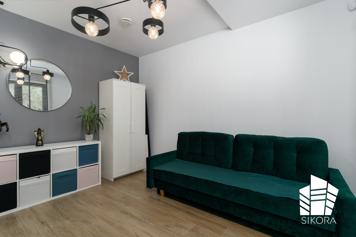 Znajdziemy tutaj wygodną rozkładaną kanapę, nowoczesne oświetlenie, komodę oraz szafę na ubrania. Całość dopełnia duże owalne lustro.