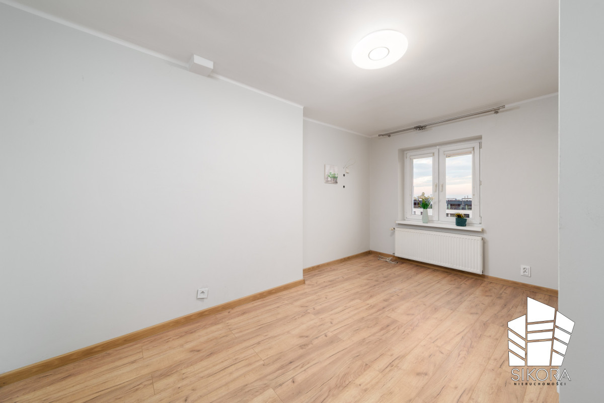 Na podłodze znajdują się panele w ciepłym, drewnianym odcieniu, które nadają wnętrzu przytulny charakter. Pokój wyposażony jest w grzejnik pod oknem oraz przygotowane instalacje do montażu oświetlenia i karnisza.