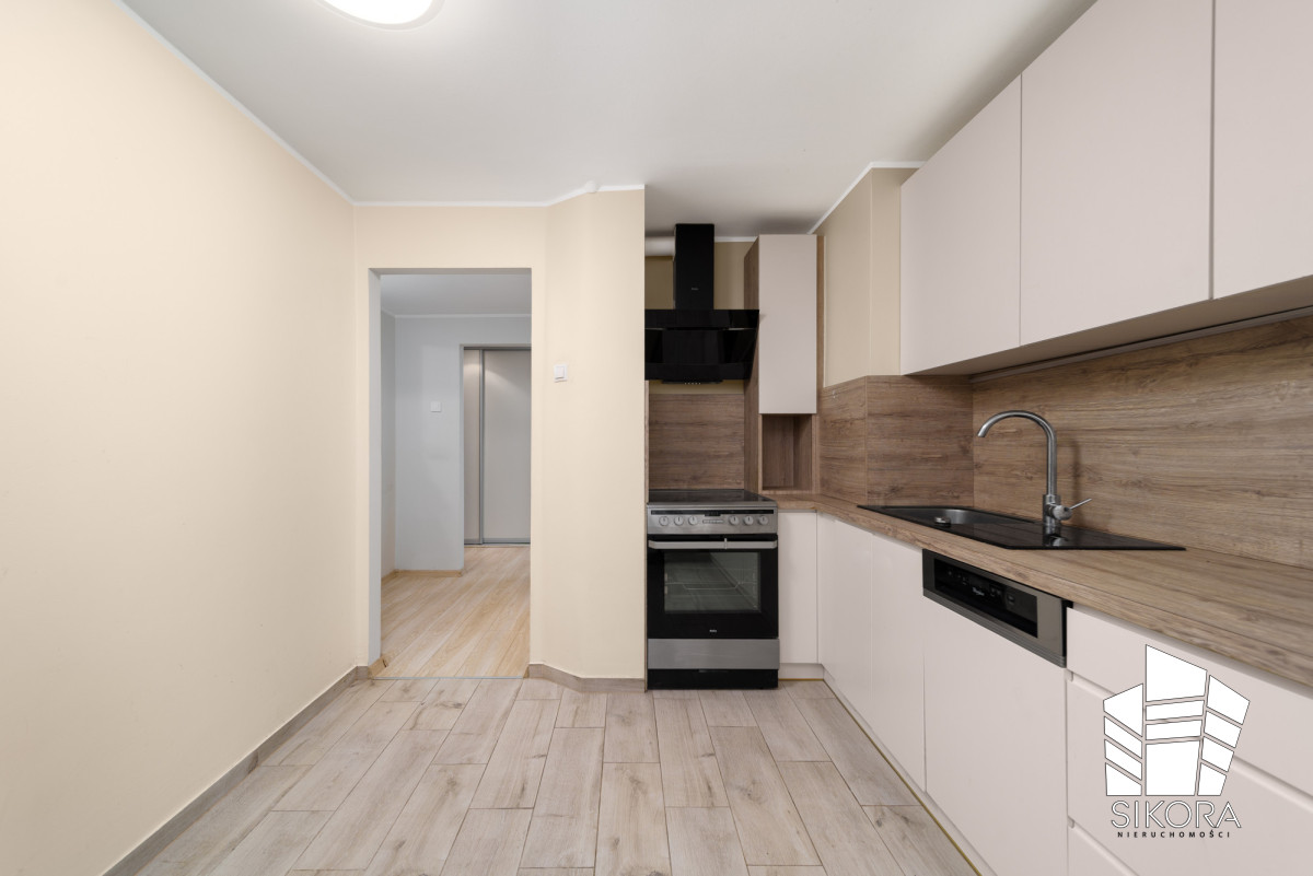 Oddzielne funkcjonalne pomieszczenie z dużym oknem, które zapewnia naturalne doświetlenie i widok na okolicę. Zabudowa kuchenna została wykonana w neutralnych, jasnych kolorach, które optycznie powiększają przestrzeń i tworzą przytulny klimat. Pomieszczenie wyposażone jest w szafki górne i dolne, oferujące dużo miejsca do przechowywania. Blat oraz panele ścienne w ciepłym odcieniu drewna nadają wnętrzu elegancji i spójności. W kuchni znajduję się także zlewozmywak, płyta grzewcza oraz piekarnik wolnostojący. Zamontowana jest również zmywarka, która zwiększa komfort codziennego użytkowania.