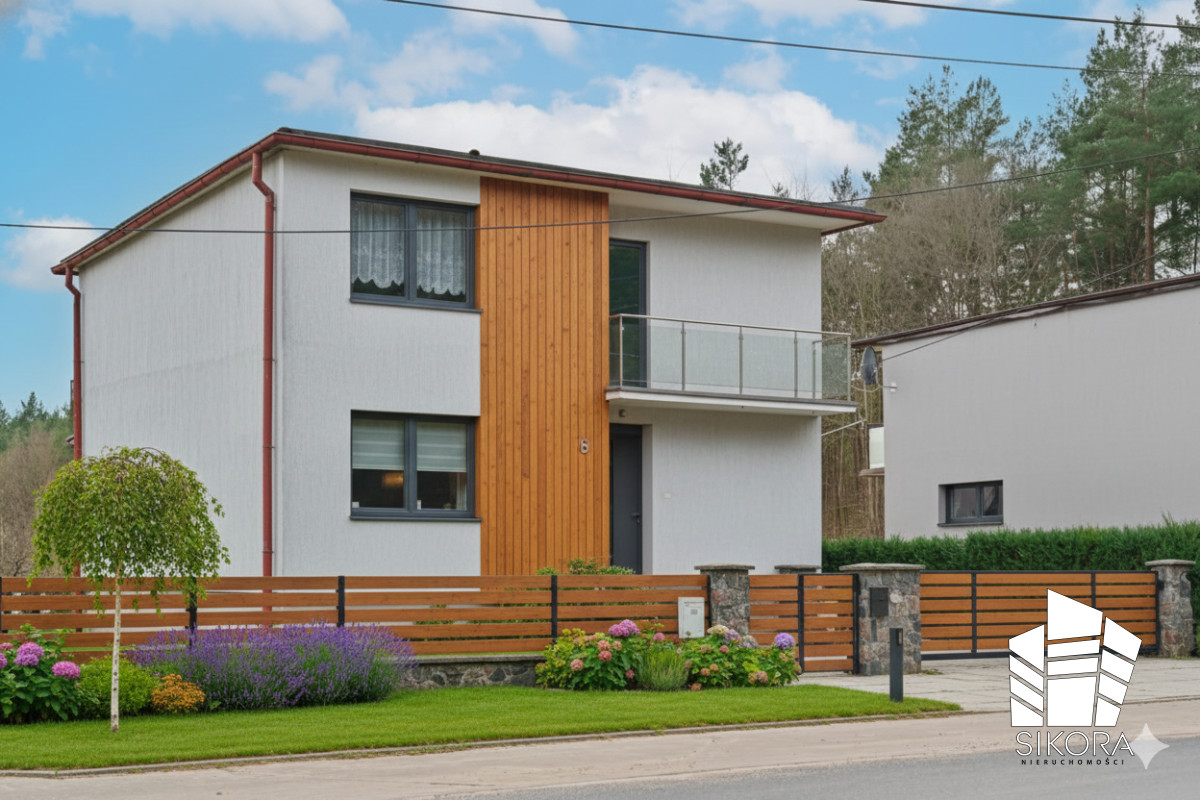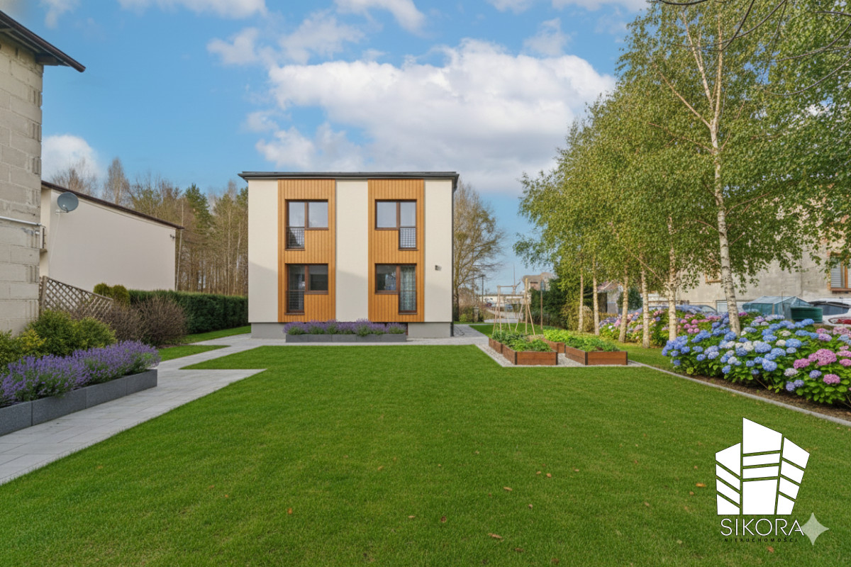 Budynek posadowiony na działce o wielkości 900 m2. Wjazd na posesję bezpośrednio do garażu podziemnego. Na froncie ogrodzenie jest murowane wraz z elementami drewnianymi, natomiast pozostała część ogrodzona jest siatką. Za domem jest do dyspozycji ogród. Ogród jest obsiany trawą, dodatkowym atutem jest altanka. Znajduje się tam również drugi budynek, który pełnił funkcję stolarni, natomiast ze względu na swoją wielkość może pełnić różne funkcje w zależności od potrzeb nowego właściciela. Znajduje się tam również powierzchnia mieszkalna, która pełniła funkcję mieszkania dla pracowników. Można go również zaadoptować jako lokal usługowy - salon kosmetyczny, fryzjerski, usługi wszelkiego rodzaju etc.