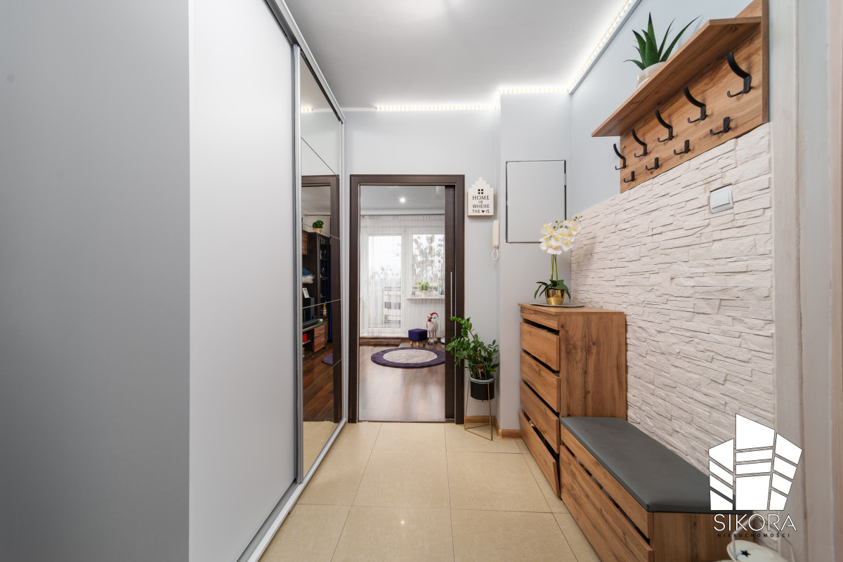 Przestronny i funkcjonalny przedpokój stanowi wygodne wprowadzenie do mieszkania, łącząc estetykę z praktycznością. Jasne wykończenie optycznie powiększa przestrzeń, a dobrze rozplanowane miejsce pozwala na wygodne przechowywanie odzieży wierzchniej, obuwia oraz innych codziennych akcesoriów. Dodatkowo przedpokój stanowi naturalne centrum komunikacyjne mieszkania, z którego wygodnie prowadzą przejścia do wszystkich pomieszczeń. Dzięki przemyślanemu układowi i neutralnej aranżacji, przestrzeń ta doskonale wpisuje się w różnorodne style wnętrz, umożliwiając swobodną personalizację.