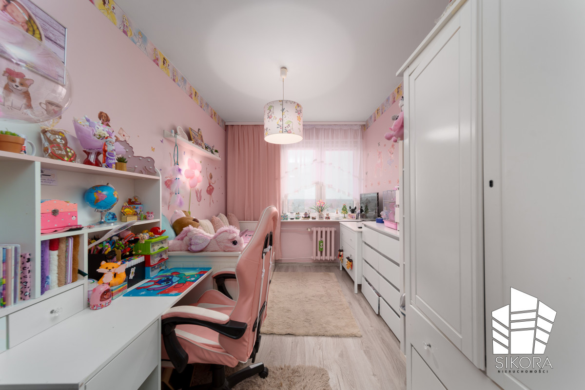 Przytulny i funkcjonalny pokój dziecięcy, idealny dla dziewczynki, utrzymany w dominującej, ciepłej różowej kolorystyce. Pokój jest ustawny i dobrze zagospodarowany, pomimo podłużnego kształtu. Zapewnia dużą ilość naturalnego światła dzięki centralnie położonemu oknu. Wyposażony w duże biurko i ergonomiczny fotel gamingowy w kolorze różowo-białym, tworzący dedykowane miejsce do nauki i spędzania wolnego czasu. Obok biurka znajduje się otwarty regał oferujący łatwy dostęp do przyborów i dekoracji. Wygodne łóżko znajduje się w tylnej części pokoju. Dekoracje ścienne, tapeta i girlandy budują ciepłą i przyjazną atmosferę. Pomieszczenie wyposażone jest w dużą, jasną szafę ubraniową oraz komodę z licznymi szufladami umieszczoną pod oknem, co zapewnia maksymalną pojemność przechowywania.