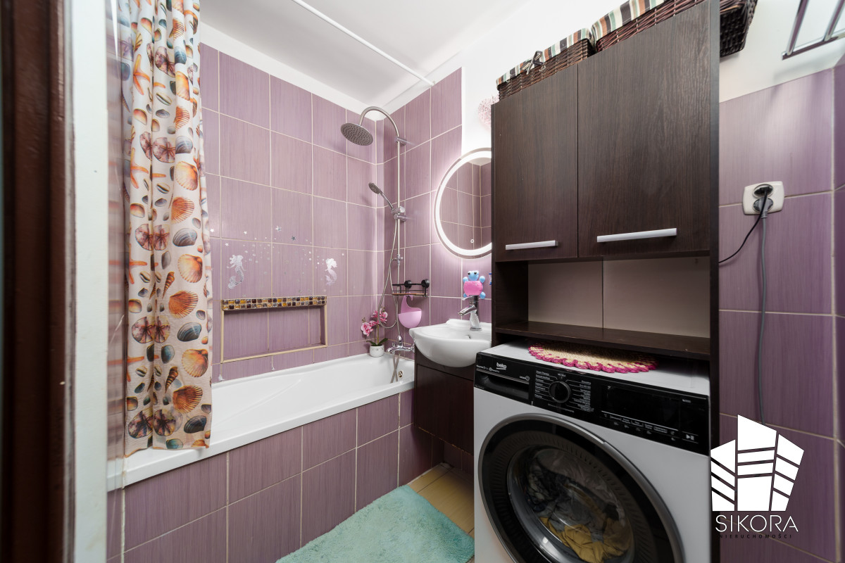 Łazienka charakteryzuje się wysoką funkcjonalnością i kompletnym wyposażeniem, stanowiąc przestrzeń gotową do użytku. Pomieszczenie zostało wykończone glazurą ceramiczną w ciepłym, różowo-wrzosowym odcieniu, która nadaje wnętrzu oryginalny i przytulny charakter. Kluczowym elementem jest strefa kąpielowa z wanną wyposażoną w nowoczesny panel prysznicowy i deszczownicę, zapewniająca elastyczność użytkowania. Przestrzeń jest inteligentnie zoptymalizowana dzięki wkomponowaniu pralki automatycznej pod solidną, ciemną zabudowę meblową. Nowoczesny akcent stanowi podświetlane lustro LED w okrągłej formie, które dodaje estetyki i zapewnia doskonałe warunki oświetleniowe do codziennej pielęgnacji.