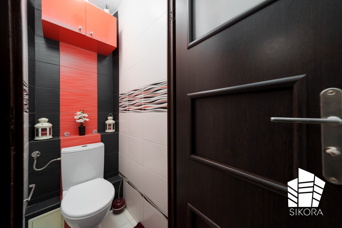 Osobna toaleta (WC) to kompaktowa, ale estetycznie wykończona przestrzeń, która wyróżnia się nowoczesnym i dynamicznym designem. Wnętrze zaaranżowane jest w kontrastowej i odważnej kolorystyce opartej na bieli, głębokiej czerni i intensywnej czerwieni. Toaleta jest wyposażona w standardową miskę ustępową oraz dyskretną półkę dekoracyjną, na której umieszczono stylowe lampiony i kwiaty, tworząc zadbany akcent wizualny.