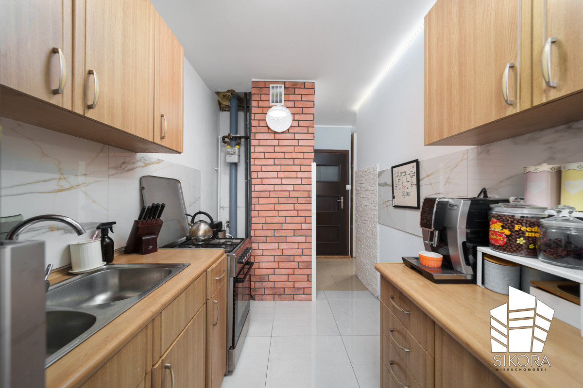 Prezentowana kuchnia to funkcjonalna i jasna przestrzeń, która pomimo kompaktowych wymiarów, oferuje maksymalne wykorzystanie powierzchni użytkowej. Zabudowa meblowa wykonana jest w jasnym odcieniu drewna (sosna/olcha), co w połączeniu z dużym oknem i jasnymi, lśniącymi płytkami podłogowymi optycznie powiększa wnętrze i zapewnia doskonałe doświetlenie naturalnym światłem. Ściana robocza zabezpieczona jest nowoczesnym, dużym panelem ściennym z dekorem marmurowym, który jest łatwy w czyszczeniu i dodaje elegancji. Kuchnia jest w pełni wyposażona w niezbędne sprzęty, w tym dużą chłodziarko-zamrażarkę oraz wolnostojącą kuchenkę gazową z piekarnikiem, co gwarantuje pełną gotowość do użytku. Solidne szafki wiszące i stojące zapewniają wystarczającą ilość miejsca do przechowywania, a dodatkowy blat roboczy przy oknie maksymalizuje komfort pracy. Jest to gotowa do użytku, zadbana kuchnia, która stanowi praktyczne zaplecze dla całej nieruchomości. Dodatkowym atutem jest z okna widok na morze.
